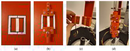 Placement steps of the specimen in the Instron test instrument. (a) The specimen anchored into the paper frame. (b) The paper frame is clamped. (c) The electrodes are glued into the internal groove of the 3D printed electrodes holder. (d) The clamped specimen is inserted into the groove of the 3D printed electrodes holder and inside the Instron test instrument. Finally, the paper frame is cut on the sides before the preloading.