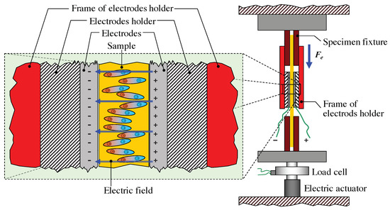 When the test starts, the specimen is stimulated by different electric fields and, as a consequence, it contracts perpendicularly to the field []. The uniaxial load test is sketched in Figure 6, where the specimen (orange), inserted into the electrodes holder (black red and red), is held by two fixtures (dark red) at a fixed position and the contraction force , perpendicular to the electric field, is measured by the load cell.