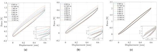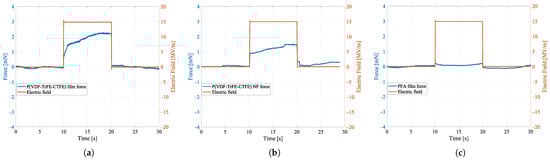 Figure 13 reports the total forces against the displacements, which have been measured in the uniaxial tensile load tests on the specimen of the P(VDF-TrFE-CTFE) film, the specimen of the P(VDF-TrFE-CTFE) nanofibers (NF) mat, and the specimen of PFA film, when different electric fields have been applied. It can be noted that, at a given displacement, the P(VDF-TrFE-CTFE)-based specimens show an increasing total force for increasing electric field. Specifically, the slopes, given by the interpolation of the force–displacement plot during the complete cycle of contraction and relaxation for each applied electric field, describe the stiffnesses of the specimens at different electric fields.