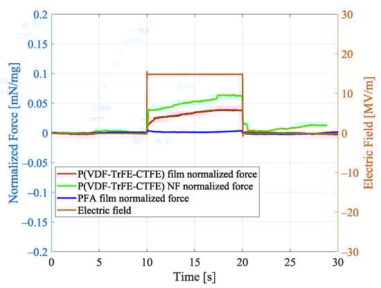Figure 8 reports the contraction forces , which have been measured in the uniaxial load tests on the specimen of the P(VDF-TrFE-CTFE) film, the specimen of P(VDF-TrFE-CTFE) nanofibers (NF) mat, and the specimen of PFA film when an electric field of 15 MV/m is applied. This specific value of applied electric field is sufficiently high to demonstrate the electrostrictive properties of the P(VDF-TrFE-CTFE)-based materials [], while avoiding the risk of dielectric breakdown especially in the nanofibers mat, which is characterized by low density. In the figure, it can be noted that, after a transient of ∼10 s from the application of the electric field, the contraction forces of the P(VDF-TrFE-CTFE)-based specimens reach a steady state, whereas, as expected, the PFA film specimen does not show any contraction force. This electro-mechanical analysis shows that both the P(VDF-TrFE-CTFE) film and the nanofibers mat are electrostrictive. Specifically, when stimulated by an electric field of 15 MV/m, the film with a weight of 57.7 mg can exert a contraction force of ∼2.2 mN, while the nanofibers mat with a weight of 23.2 mg can exert a contraction force of ∼1.5 mN.