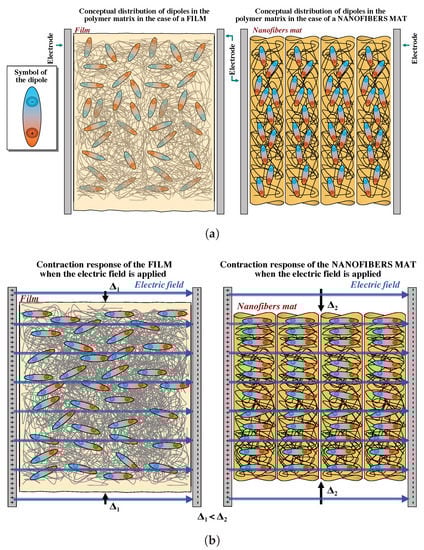 Schematic representation of a film and a nanofibers mat. (a) Randomly oriented dipoles in the film and in the nanofibers mat without any applied electric field. (b) When an electric field is applied, the dipoles are oriented according to the electric field, and therefore both specimens contract. The nanofibers shows a larger contraction when compared to the contraction of the film.