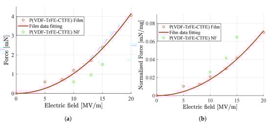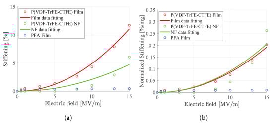 Figure 14 shows, for different electric fields, the percentage increase in the stiffness of the specimens of the P(VDF-TrFE-CTFE) film, P(VDF-TrFE-CTFE) nanofibers (NF) mat, and PFA film. In particular, Figure 14a reports the stiffening of the specimens, calculated as the percentage increase of the stiffness for different electric fields with respect to the stiffness of the specimens without any applied field. Figure 14b reports the stiffening of the different specimens, normalized to the weight of the material. It can be noted that, when the external electric field increases, the P(VDF-TrFE-CTFE)-based specimens show a stiffening behavior, whereas, as expected, the PFA film does not show any stiffening behavior if small stiffness variations are excluded, as all dielectrics exhibit an electrostrictive effect [].