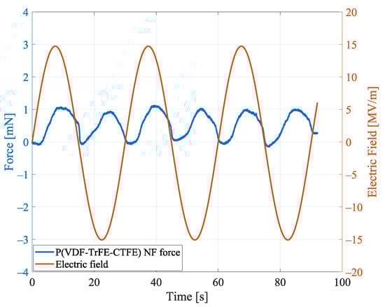 To show repeatability in the uniaxial load test for the specimen of aligned nanofiber mat (NF), Figure 12 reports the contraction forces when a sinusoidal electric field, with an amplitude of 15 MV/m and a period of 30 s, is applied.