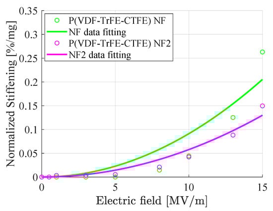 From the figure, it can also be noted that, for the P(VDF-TrFE-CTFE)-based specimens, there is a quadratic dependency of the stiffness increment with respect to the applied electric fields. This quadratic dependency is due to electrostriction (see Equation (1)) and can be described by