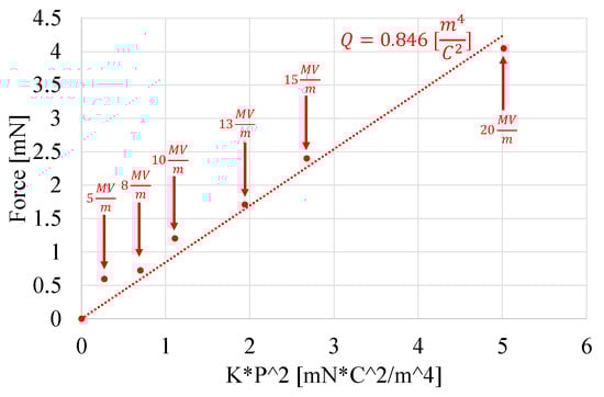 Figure 16 derives the value of electrostrictive coefficient Q for the P(VDF-TrFE-CTFE) film by using Equation (3). In particular, the maximum contraction forces (measured at steady state, i.e., after ∼10 s from the application of the electric field, in the uniaxial load test for the P(VDF-TrFE-CTFE) film against different electric fields and reported in Figure 11a) have been plotted against the field-dependent stiffness (experimentally derived and reported in Figure 14a) multiplied by the square of the polarization P. It can be noted that the electrostrictive coefficient Q is experimentally calculated by linear fitting and has a value of 0.846 m4/C2 [,].