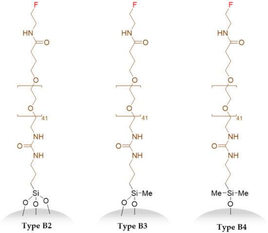 - Adumeau, L.; Genevois, C.; Roudier, L.; Schatz, C.; Couillaud, F.; Mornet, S. Impact of surface grafting density of PEG macromolecules on dually fluorescent silica nanoparticles used for the in vivo imaging of subcutaneous tumors. Biochim. et Biophys. Acta (BBA) Gen. Subj. 2017, 1861, 1587–1596. [Google Scholar] [CrossRef] [PubMed]