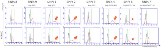 2.4. Grafting of Hybrid Peptides on Fluorescent SiNPs (Example for 9, 10 and 11 Hybrid PEG–Peptides, with a 1/1/1 Ratio)