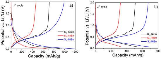 Figure 5 displays the potential profiles of the three studied Si-NiSn composites for the first and third cycles. At the first cycle, discharge (lithiation) profiles show a shoulder at 1.25 V attributed to the formation of the Solid Electrolyte Interface (SEI). Then, the potential profiles gradually decrease down to 0 V, showing several steps (~0.65, 0.40 and 0.35 V) for SiR-NiSn, while the coated SiC-NiSn and SiO-NiSn composites have smooth potential profiles. Among the three composites, SiC-NiSn has the lowest polarization potential. The first lithiation capacity is much lower for the oxide-coated SiO-NiSn (685 mAh/g) than for SiR-NiSn and SiC-NiSn (950 and 1195 mAh/g, respectively). On charge (delithiation), either smooth or staircase potential profiles are again observed for coated (SiC-NiSn and SiO-NiSn) and bare (SiR-NiSn) composites, respectively. At the third cycle, potential profiles show no evidence of SEI formation, and similarly to the 1st cycle, they are smooth for the coated composites while the bare composite has a staircase potential profile.