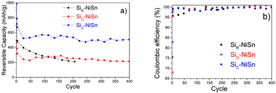 The evolution of reversible capacities (delithiation) and coulombic efficiency on cycling for the three composites is shown in Figure 6. For all composites, a significant capacity decay is observed during the first three activation cycles. Then, for the bare SiR-NiSn composite, the capacity gradually decreases from 400 mAh/g at cycle 25 down to 210 mAh/g at cycle 200. In contrast, for the coated composites the capacity remains stable on cycling after activation, being significantly higher for SiC-NiSn than for SiO-NiSn. After 400 cycles, their reversible capacities are 505 and 215 mAh/g, respectively. As for the coulombic efficiency, εc (Figure 6b), it strongly depends on the composite at the first cycle. It ranges between 68% for oxide-coated SiO-NiSn and 83% for the carbon-coated SiC-NiSn composite. For the next cycles, the coulombic efficiencies drastically increase for all composites with typical values above 99.5%.