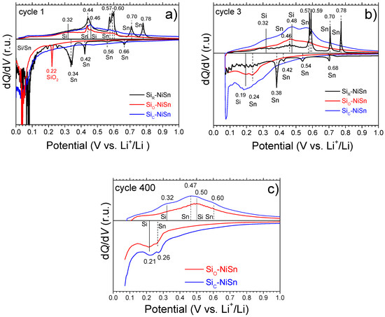 Figure 7 displays the DCP plots for the three composites at the 1st, 3rd and 400 cycles. For the first galvanostatic cycle of the bare SiR-NiSn composite (Figure 7a), four clear reduction peaks of moderate intensity are observed at 0.66, 0.56, 0.42 and 0.34 V and a broad additional one below 0.1 V. The first four peaks are attributed to lithiation of the main phase (free Sn), whereas the latter one is assigned to the formation of Li-rich LiySi and LizSn alloys [31]. In the anodic branch, four clear oxidation peaks are observed at 0.44, 0.58, 0.70 and 0.78 V, which are attributed to the decomposition of the different LizSn alloys (Li7Sn2, Li5Sn2, LiSn and Li2Sn5) in agreement with previous reports [38,42]. The signal at 0.58 V is in fact a triplet due to the decomposition of three LizSn alloys of close composition: Li13Sn5, Li5Sn2 and Li7Sn3 [42,43]. In addition, an anodic bump and a broad oxidation peak can be observed at 0.32 and 0.46 V, which are attributed to the decomposition of amorphous Li3.16Si and Li7Si3 alloys, respectively [20,38,44]. The detected dQ/dV peaks for the first galvanostatic cycle in the bare SiR-NiSn composite are consistent with the coexistence of pure Si and Sn phases (Table 2). The width of the peaks is anticorrelated with the crystallinity of the phases: anodic peaks due to decomposition of amorphous LiySi alloys formed during the first composite lithiation [45] are wider than those of the crystalline LizSn ones [46]. Interestingly, at the third cycle (Figure 7b), dQ/dV peaks attributed to the formation and decomposition of LizSn alloys are sharper than those of the first cycle, which suggests the coarsening of Sn domains on cycling [47]. This agglomeration favorizes discrete volume changes, leading to electrode cracking [19] and severe capacity decay for the bare SiR-NiSn composite, as observed in Figure 6a.