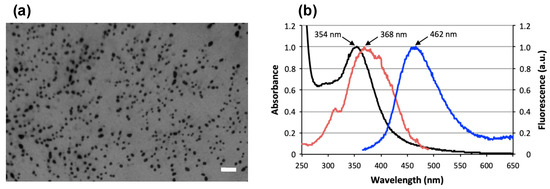 (a) Morphology of the bPEI600-based CDs as observed by TEM (scale bar = 200 nm). (b) Optical properties of the CDs: absorption (black), excitation (red), and emission (blue; excitation at 355 nm) spectra.