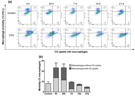 Macrophage mortality induced by CDs was assessed by combined analysis of CD-associated fluorescence (X-axis) and fluorescence of the TO-PRO-3 cell mortality marker (Y-axis) (Figure 4a). Thus, different macrophage populations were discriminated: living macrophages with no CD uptake; living macrophages with CD uptake; dead macrophages without CD uptake; dead macrophages with CD uptake. As shown on Figure 4b, a macrophage mortality of approximately 15% was found in control mice, which is in agreement with what is generally reported in studies performing FACS on BALFs [38]. In contrast, significant macrophage mortality was observed in BALFs from mice exposed to CDs, since cell death affected almost 50% of the total macrophage population at 4 h and 24 h after exposure to the NPs. Among the dead macrophages, between 20% and 25% of the cells contained CDs at 4 h and 24 h, respectively. These data suggest that CDs can exert a direct toxicity on macrophages after their cell uptake. However, macrophage mortality decreased sharply from 7-d post-exposure and returned to a level comparable to control at 21 d after CD exposure, suggesting that there is a possible recovery of the alveolar macrophage population from 21 d after a unique CD exposure.
