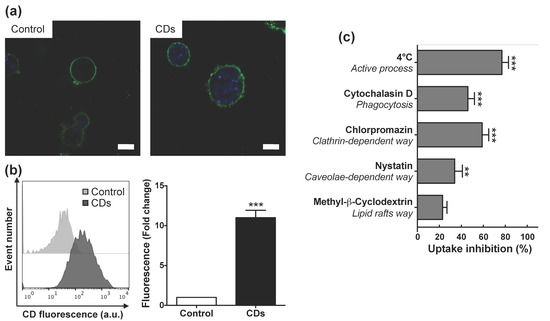 As toxicity of NPs generally involves their cell entry [48], we first investigated cell uptake of CDs by macrophages and its associated mechanisms. Following incubation of cells with non-cytotoxic concentration (25 μg/mL) of CDs for 4 h, CDs were visible in the cytoplasm of macrophages as blue spots by CLSM (Figure 5a), whereas no such spots were visible in control cells. As shown on Figure 5b, a quantitative analysis conducted by FACS highlighted an increase in CD fluorescence signal into macrophages (10.9-fold compared to control, p < 0.001), which confirmed CD internalization by these cells in vitro. This uptake of CDs by cultured macrophages is in agreement with our present in vivo data, and with our previous in vitro studies reporting efficient cell uptake of bPEI25k-based CDs by macrophages [36].
