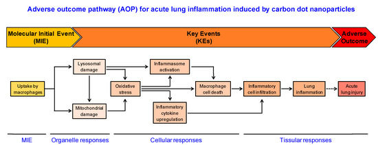Putative AOP related to the acute lung inflammation induced by polyamine-based cationic CDs. The uptake of CDs by macrophages constitutes the MIE, followed by the KEs, which are the loss of lysosomal integrity and mitochondrial disruption (organelle responses), oxidative stress, inflammasome activation, inflammatory cytokine upregulation and macrophage death (cellular responses). All these effects may trigger inflammatory cell infiltration, leading to lung inflammation (tissular responses).