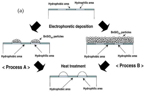 Electrophoretic deposition is a well-known, versatile technique for the deposition of thin or thick films on conductive substrates under an electric field [,,]. The fast deposition rate that enables thick-film formation is one of the advantages of this technique. By controlling the applied voltage, deposition time, and suspension concentration, the thickness of the deposited film can be controlled []. For electrophoretic deposition, a stable suspension with uniform particle distribution is vital for obtaining an excellent deposited film. Therefore, in electrophoretic sol–gel deposition, sol–gel derived particles are used. This process can be applied for various applications.