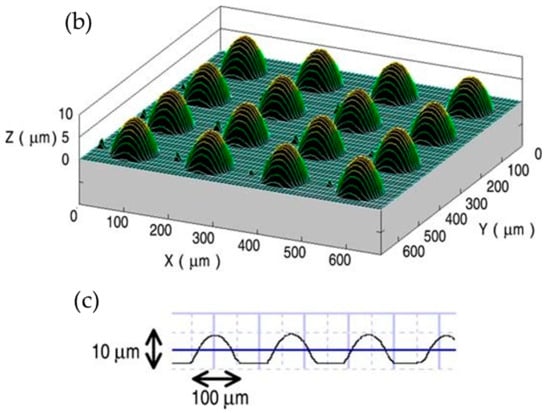 Through micropatterning, thick transparent sol–gel films can be applied as wavelength guides and micro-optical components. Using the electrophoretic sol–gel deposition of benzyl-silsesquioxane (BnSiO3/2) molten liquid between a hydrophobic fluoroalkylsilane surface and a hydrophilic silica surface, Takahashi et al., demonstrated the feasibility of micropatterning transparent BnSiO3/2 thick films, as shown in the schematic of Figure 2a. Using indium tin oxide glass as the substrate, hydrophobic–hydrophilic patterns were prepared using the sol–gel method prior to the electrophoretic deposition of BnSiO3/2. Then, heat treatment above the glass transition temperature led to the migration of BnSiO3/2 liquids from the hydrophobic areas to the hydrophilic areas [,,,]. The three-dimensional surface and cross-sectional profiles of convex-shaped BnSiO3/2 micropatterns are shown in Figure 2b,c, respectively.