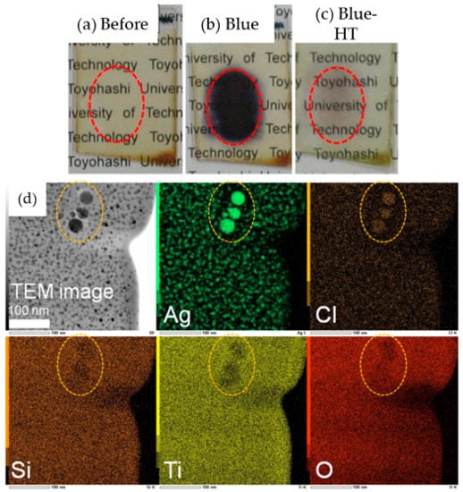 (a–c)Photographic images of a 30Ag15Cl:40GPSiO3/2-60TiO2 (GP: Glycidoxypropyl, mol%) film before and after blue laser irradiation and subsequent heat treatment. (d) Cross-sectional TEM image and corresponding EDX mapping of a 30Ag15Cl:40GPSiO3/2-60TiO2 film after blue laser irradiation. The circles indicate the same region in all the sections. Reprinted with permission from [], copyright (2011) Elsevier.