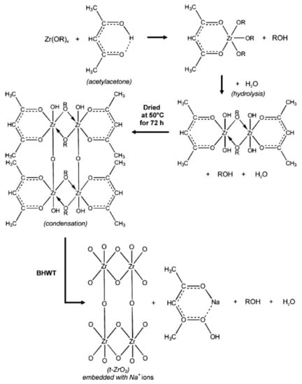Besides TiO2, it has also been demonstrated that HWT can be used for the crystallization of sol–gel derived zirconium oxide (ZrO2) powder, but under basic conditions []. This is due to the low solubility of ZrO2 in water at the neutral condition (pH 7). Using the HWT (90 °C) of ZrO2 gel powders at pH 14 with the addition of NaOH, the formation of tetragonal-phase ZrO2 was obtained. The concurrent effective removal of organic compounds from the sol–gel derived ZrO2 NPs also occurred. The precursor used in their study was zirconium n-butoxide (Zr(n-OBu)4) and acetylacetone was applied as a chelating agent []. A hydrolysis reaction was induced using ion-exchanged water with nitric acid as a catalyst. They reported that basic HWT is crucial for the preparation of fine ZrO2 crystals with a high surface area. The specific surface areas obtained for the amorphous as-obtained gel after drying and the tetragonal ZrO2 (crystal size of 18 nm) after basic HWT for 24 h were 17 and 275 m2/g, respectively. Based on the reaction that occurred during the basic HWT, Prastomo et al., proposed the formation mechanism, as shown in Figure 7. First, there is a reaction between the dissolved zirconia alkoxide in ethanol and the acetylacetone-generated, chelated zirconia–acetylacetone complex. During the hydrolysis process, an interconnected network structure is formed, which is then condensed upon drying. When the chelated ZrO2–acetylacetone complex is hot-water treated in a basic NaOH solution, porous and organic free ZrO2 is formed with the dissolution of acetylacetone, from the complex into the solution, as sodium acetylacetonate. At a relatively high HWT temperature (90 °C), a higher reaction rate is promoted, leading to an increased collision rate of the particles. The unpaired bonds that are generated after the organic compound removal then provide sites for further strengthening of the ZrO2 interconnected network. This enables the formation of a basic hot-water treated gel structure with a high surface area. Besides that, the simultaneous incorporation of Na ions into the ZrO2 structure plays an important role in the stabilization of ZrO2 crystals, favoring the formation of tetragonal-phase ZrO2 [].