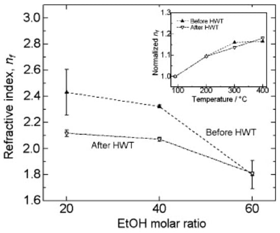 Refractive index of ZrO2 thin film as a function of the molar ratio of ethanol/Zr[O(CH2)3CH3]4 before and after HWT (annealed at 400 °C). Inset is the normalized refractive index of ZrO2 film before and after HWT, which was annealed at various temperatures (molar ratio of ethanol: Zr[O(CH2)3CH3]4 = 60:1.25). Reprinted with permission from [], copyright (2012) Elsevier.
