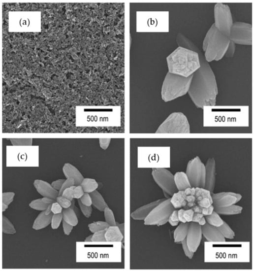 Zinc oxide (ZnO) is one of the extensively investigated transparent conductive oxides owing to its high exciton binding energy (60 mEV) and wide band gap of 3.37 eV [,,]. These properties allow ZnO to be used in various applications, such as optical waveguides, piezoelectrics, conductive gas sensors, transparent conductive electrodes, photocatalysts, and DSSCs []. A comprehensive review on ZnO thin film formation by the sol–gel method was reported by Znaidi []. The effects of parameters such as sol concentration [], doping [,,], sol aging [], sol water content [], and deposition temperature [] on the optical and electrical properties of sol–gel derived ZnO thin films have been reported. Then, Matsuda et al., demonstrated the control of ZnO crystallite morphology during a HWT at a low-temperature of 50 °C of ZnO gel films by applying an electric field []. The effects of time, voltage, and substrates (FTO glass and Si wafer) were investigated. On FTO substrates, the ZnO crystallites transformed from granular to columnar hexagonal structures when an electric field was applied. Interestingly, as for the ZnO sol–gel derived coating on a Si wafer, flowerlike hexagonal ZnO nanostructures were obtained when an electric field was applied. The application of the electric field influenced the orientation of the ZnO crystals, leading to the formation of this unique morphology, and the branching level increased when higher voltage was applied, as shown in Figure 9.