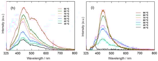 In a different study, Tan et al., investigated the effects of HWT temperature (30 °C to 90 °C for 1 h) on ZnO nanostructures, as well as their photoluminescence properties. With increasing HWT temperature from 30 °C to 90 °C, the morphology of the ZnO crystals transformed from spherical, rod-like, and finally needle-like nanostructures, as shown in Figure 10a–g. During the HWT, repetitive dissolution and re-deposition occurred, resulting in lattice and surface defect generation within the ZnO nanostructures. This led to the observation of prominent blue and suppressed green photoluminescence properties. Although the relative photoluminescence intensity in the blue region reduced after heat treatment at 400 °C for 1 h from a reduction of oxygen vacancies, it is noteworthy that the blue photoluminescence could still be observed, as indicated in Figure 10h,i [].