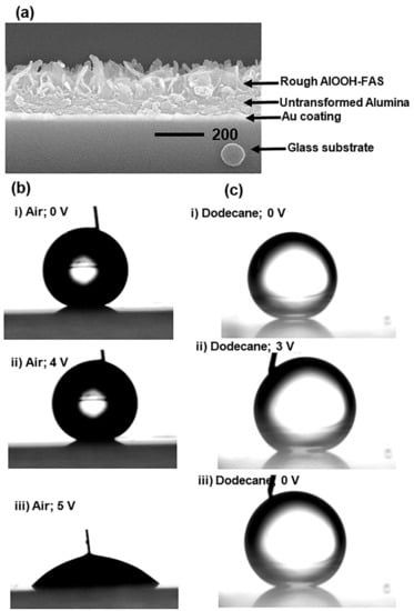 (a) FESEM cross-sectional image of sample for EW & REW; droplet images of (b) EW in air and (c) REW in dodecane medium. (b(i)) sessile droplet with an inserted gold (Au) conductor with 0 V supply, CA = 155.4 ± 0.6°; (b(ii)) 4 V supply, CA = 153.3 ± 0.4°; (b(iii)) 5 V supply, CA = 48.5 ± 1.2°. (c(i)) droplet with 0 V, CA = 161.3 ± 0.4°; (c(ii)) droplet with 3 V supply, CA = 152.4 ± 0.6°; (c(iii)) reversed electro-wetted droplet when voltage was turned off, CA = 157.3 ± 0.8°. Reprinted with permission from [], copyright (2017) Elsevier.