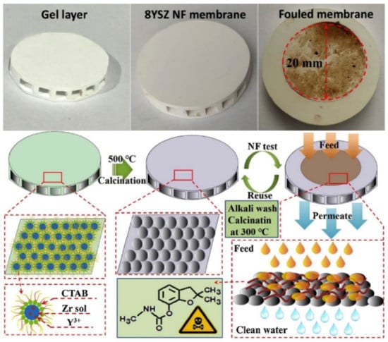 Procedure for 8-mol% yttria-stabilized ZrO2 nanofiltration membranes formation by reverse micelles-mediated sol–gel process and carbofuran removal. Reprinted with permission from [], copyright (2020) Elsevier.