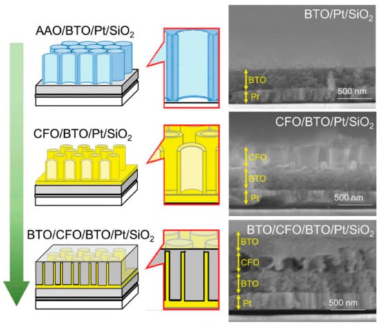 - Kawamura, G.; Ohara, K.; Tan, W.K.; Goto, T.; Nakamura, Y.; Inoue, M.; Muto, H.; Yamaguchi, K.; Boccaccini, A.R.; Matsuda, A. Multiferroic nanocomposite fabrication via liquid phase using anodic alumina template. Sci. Technol. Adv. Mater. 2018, 19, 535–542. [Google Scholar] [CrossRef] [PubMed]