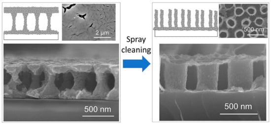 Titanium dioxide (TiO2) is a well-known photocatalyst with many exceptional properties. One way to obtain TiO2 nanocomposites, as well as porous films with high surface areas, is to use the sol–gel method. The presence of TiO2 in anatase form is the most beneficial for photocatalysis applications, but the required heat treatment leads to the formation of a rather opaque film. In a novel low-temperature fabrication of anatase TiO2, Matsuda et al., demonstrated the feasibility of forming transparent anatase nanocomposite films by hot-water treating SiO2–TiO2 gel films []. They also reported that the addition of poly(ethylene glycol) (PEG) into the SiO2–TiO2 gel films led to the formation of TiO2 anatase crystals within the entire film, compared with the formation of the crystals only at the surface when PEG was not added []. The mechanism involved during the HWT was the following: (i) hydrolysis of Si–O–Ti bonds and dissolution of the SiO2 component, (ii) migration of hydrolyzed titania species from the interior to the surface of the coating, and (iii) nucleation and growth of titania nanocrystals in the residual coating.