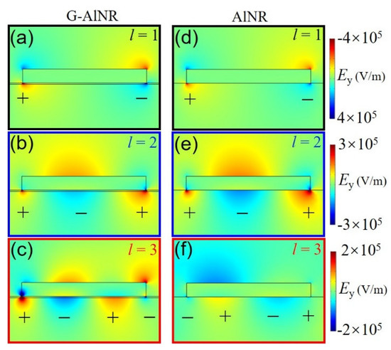 Electric field distributions of Ey and surface charge distribution from front view (in xz plane) of each plasmon mode for G-AlNR and AlNR: (a) l = 1, G-AlNR; (b) l = 2, G-AlNR; (c) l = 3, G-AlNR; (d) l = 1, AlNR; (e) l = 2, AlNR; and (f) l = 3, AlNR. Subplots (a,d), (b,e) and (c,f) are in the same scale, respectively.