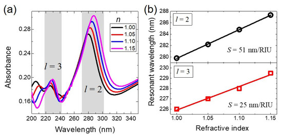 Finally, we explore the potential of the plasmonic high-order mode of the G-AlNR structure for UV sensing applications. In Figure 5a, the absorption spectra of the G-AlNR structure embedded in different surrounding media are calculated under TM polarization with inclined incidence angle (θ) of 30°. The geometrical parameters are the same as shown in Figure 1b. The spectral redshifts of two peaks (l = 2 and l = 3) are observed when the refractive index of the surrounding media is changed from 1.00 to 1.15. The linearly fitted sensitivity S (S = Δλ/Δn) at UV range for the two peaks (l = 2 and l = 3) are 51 and 25 nm/RIU, respectively, as shown in Figure 5b. Here, Δλ and Δn are the wavelength shift and refractive index change, respectively. We further quantify the figure of merit (FOM), which is defined as the sensitivity divided by FWHM [30,31,32,33]. For the two peaks of l = 2 and l = 3, the two corresponding FWHMs are 27.5 and 8.5 nm. Thus, the FOMs of the two plasmonic modes (l = 2 and l = 3) of our proposed G-AlNR in UV range are 1.9 and 3, respectively, providing the practical applications such as ultraviolet refractive-index sensing.