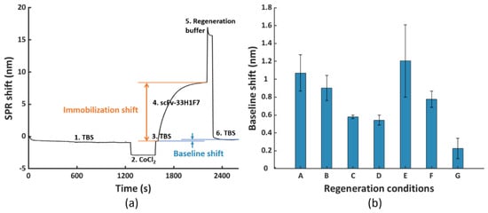 (a) The fiber−optic−surface plasmon resonance (FO−SPR) sensorgram representing one regeneration cycle including (1, 3 and 6) immobilization buffer (TBS) stabilization, (2) formation of the Co(II)−NTA chelate, (4) immobilization of His6−tagged scFv−33H1F7 (at 20 μg/mL) and (5) removal of scFv−33H1F7 to regenerate the NTA surface following different regeneration conditions. The represented sensorgram was obtained using condition G. (b) The obtained baseline shifts after removal of scFv−33H1F7 following seven different regeneration conditions (conditions A to G, as detailed in Section 2.3). Each bar represents the average value of two parallel measurements performed on two different FO sensor probes, with error bars being standard deviations (ns = 2).