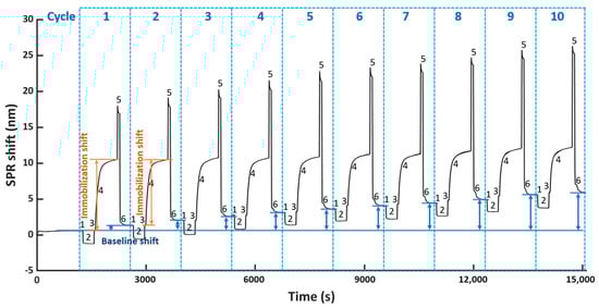 The FO−SPR sensorgram representing ten regeneration cycles, including (1, 3 and 6) TBS stabilization, (2) formation of the Co(II)−NTA chelate, (4) immobilization of scFv−33H1F7 at 20 μg/mL and (5) removal of scFv−33H1F7 to regenerate the NTA surface using condition G. The baseline shift (blue arrows) for each cycle and the immobilization shift for cycle 1 and 2 (orange arrow) are depicted.