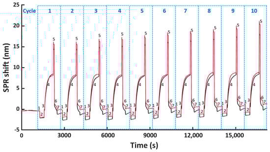The FO-SPR sensorgram obtained from two parallel FO probes representing ten regeneration cycles of His6−tagged scFv−33H1F7, including the following steps: (1, 3 and 7) TBS stabilization, (2) formation of the Co(II)−NTA chelate, (4) immobilization of scFv−33H1F7 at 20 μg/mL, (5) removal of scFv−33H1F7 and (6) washing with NaOH, using the optimized regeneration protocol (i.e., condition G combined with 3 min washing in 0.5 M NaOH).