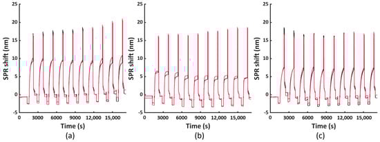 The FO−SPR sensorgrams obtained from two parallel FO probes representing ten regeneration cycles, performed using the optimized regeneration protocol (i.e., condition G combined with 3 min washing in 0.5 M NaOH), shown for different His6-tagged bioreceptor model systems: (a) RBD, (b) RFP and (c) Tet12SN−RRRR.