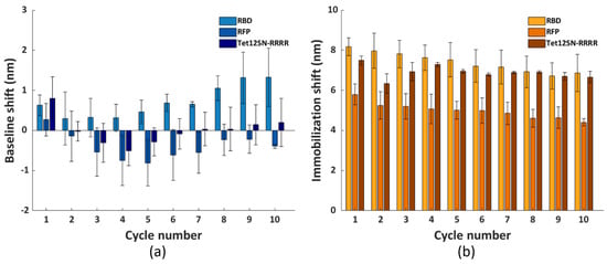 The (a) baseline and (b) immobilization shifts for each cycle, obtained with immobilizing RBD, RFP and Tet12SN−RRRR at 20 μg/mL. The surface regeneration was performed using condition G and washing with 0.5 M NaOH for 3 min, for a total of ten cycles. Each bar represents the average value from two parallel measurements performed on two different FO sensor probes, with error bars being standard deviations (ns = 2).