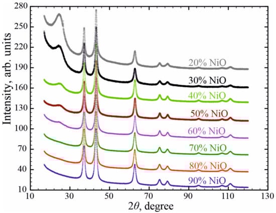 Spectra can be conventionally divided into two groups: (i) spectra of samples with NiO concentration of 10%, 20%, 30%, 50% and 80%—in these spectra the Vulcan peaks are most pronounced and the NiO peaks are weakly visible (Figure S4); (ii) spectra of samples with NiO concentration of 40%, 60%, 70%, 90%—in these spectra the NiO peaks are most pronounced and the Vulcan peaks are weakly visible (Figure S5).