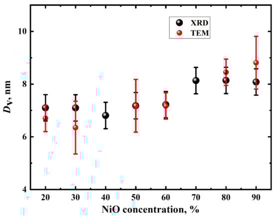 Nanoparticle average sizes evaluated from XRD (black circles) and TEM (red circles) data.