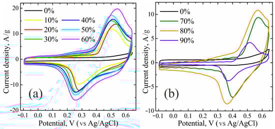 The electrochemical results of all NiO/C composites, obtained in a three-electrode cell, are plotted in Figure 4 and Figure 5. The cyclic voltammograms (CVs) can be divided into two groups with respect to their profiles (Figure 4). The first group comprises the composites with nickel oxide contents ranging from 10 to 60 wt% inclusively (Figure 4a). The current peaks of the higher nickel oxide formation at potentials unfolding towards the anodic range, as well as the appropriate current peaks of the higher nickel oxide reduction upon the potential unfolding towards the cathodic range in a series from 10 wt% to 60 wt%, increase regularly with the NiO amount, and all CVs exhibit an analogous conventional shape. The second group (Figure 4b), including NiO/C composites with NiO concentrations from 70 to 90 wt%, evidences no regularities from the first group. Along with galvanostatic data for all composites, displayed in Figure 5, such a division into two groups can be explained in the context of the percolation theory in strongly inhomogeneous media []. NiO/C composites are composed of a low-conductivity semiconducting component of nickel oxide (10−9 S cm−1 []) and an electron conductor of Vulcan carbon soot at their certain ratio, which ensures sufficient conductivity. According to earlier studies [], starting from the volume soot concentration of 65 vol% (which corresponds to ~40 wt%), the electron conductivity of a composite becomes commensurate to that of pure soot, which allows the electrochemical data to be interpreted in a correct manner.