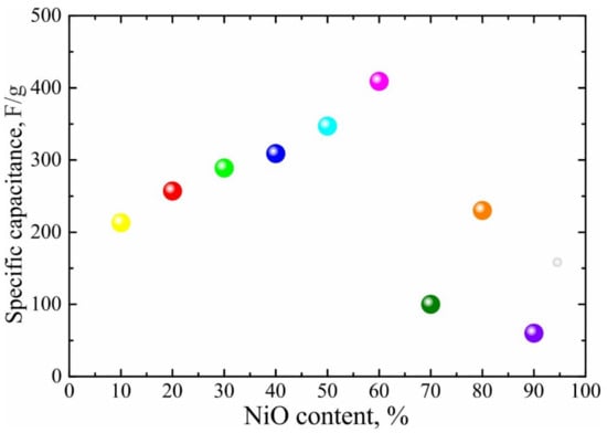 Specific capacitance as a function of NiO content in NiO/C composites at a current density of 0.5 F g−1 in a three-electrode cell in a 1 M KOH solution. The results are divided into two groups.