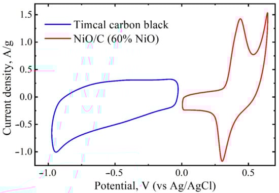 The CVs of NiO/C (60 wt%) samples (Figure 6a) exhibit a pronounced anodic peak, associated with a higher oxide formation on the surface, and a cathodic peak of their reduction described by the following Equation (1):