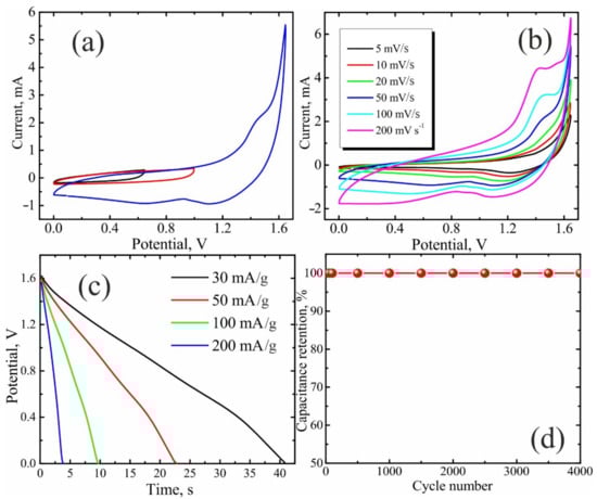 The electrochemical performance of the two-electrode system was tested via CV and GCD measurements. CV measurements were carried out in a potential range of 0 to 1.65 V at different scan rates. The GCD and cycle-life/stability studies were implemented in the same potential range. In the context the GCD process, the specific capacitance of a two-electrode system was obtained, as follows []: