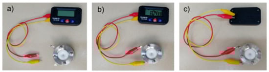 Application of the asymmetrical two-electrode assembled cell (NiO/C (60 wt% NiO) as a positive electrode and CB Timcal Super C65 as a negative electrode) in a 6 M KOH aqueous solution: (a) photograph of an asymmetrical two-electrode assembled cell charged at 0.5 mA and a battery-free quartz clock; (b) photograph of a quartz clock (front side) in the process of charging; (c) photograph of a quartz clock (back side) in the process of charging.