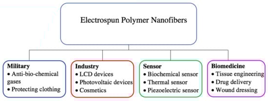 Nanofibers, due to their outstanding properties such as porosity, ease of synthesis, controlling of their composition, mechanical, and surface features, are distinct from other types of nanostructures [22,23,24]. Their applications, as shown in Figure 3, have been assessed in various fields, such as biomedicine, sensor, military and industry [25,26,27,28,29]. In the biomedical field, nanofibers have gained recognition in tissue engineering [30,31,32]. As most of the human organs and tissues are constructed of fibrous frameworks, nanofibers are ideal for mimicking and fabrication of artificial matrices that provide appropriate environments for cell functions [33,34,35]. Many biological assays have shown that nanofibers are extensively applicable as ECM scaffolds, as they obtain a vast surface area for cell adherence compared to bulk fibers [36,37,38]. Moreover, the architecture of nanofibers resembling the native ECM provides effective passage for oxygen and nutrition transportation [39].