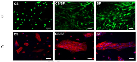 (A) SEM pictures of SF/chitin nanofibers at magnification 5000×. Reproduced from reference [82] with a permit from Elsevier. (B) Live-dead [88] and (C) phalloidin-DAPI staining [91] of human bone marrow stem cells seeded on CS fibers, SF and CS/SF nanofibers after 72 h. Scale bar is 100 μm in (B) and 50 μm in (C). Reproduced with permission from Elsevier.