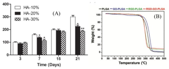 (A) Cell proliferation on 10% HA, 20% HA and 30% HA scaffolds performed by alamarBlueVR assay. Duplicated from reference [105] with a permit from Wiley. (B) Thermogravimetric analysis of arginylglycylaspartic acid (RGD)– graphene oxide (GO)–poly(lactic-co-glycolic acid) (PLGA). Duplicated from reference [109] with permission from Oxford University Press.