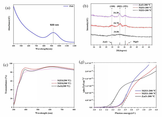 (a) Absorbance spectra of PbS CQDs for all devices listed here. (b) XRD pattern of ZnO and Mg-doped ZnO (MZO) thin films. (c) The transmission spectra of MZO with low annealing temperature (200 °C) and high annealing temperature (300 °C) and undoped ZnO thin film annealed at 300 °C. (d) The plots of (ahv)2 versus photon energy for MZO and ZnO thin films.