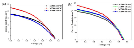 The MZO is a good ETL for PbS CQD solar cells due to the high transparency and high conduction band. To ascertain the optimal temperature and thickness of the PbS CQD active layer and MZO ETL for solar cells, devices with an inverted structure of ITO/MZO/PbS/Au were fabricated by depositing six PbS CQD layers on MZO film. A control device with ZnO ETL was also fabricated with the same conditions. It is obvious that an appropriate annealing temperature and thickness of MZO are necessary to obtain high-quality ETL thin films [31]. The current density–voltage characterization under dark conditions or 100 mW cm−2 (AM 1.5G) illumination (the irradiation area is 100 cm2) with a solar simulator (XES-40S1, SAN-EI electric) was carried out on a computer-controlled Keithley 2400 Source Meter system in ambient conditions. The J-V curves of PbS CQD solar cells with different annealing temperatures and thicknesses are presented in Figure 3a,b, and the photovoltaic performance is summarized in Table 1. To figure out the effects of annealing temperature on CQD device performance, the thickness of MZO is fixed at 50 nm for all cases. The devices with MZO annealed at a temperature of 300 °C showed the highest efficiency of 4.94% with a short circuit current density (Jsc) of 22.44 mA/cm2, an open circuit voltage (Voc) of 0.55 V, and a fill factor (FF) of 39.75%. On the other hand, the devices annealed at a low temperature exhibited the lowest PCE (4.32%) due to the reduction of Jsc. Increasing the annealing temperature further to over 350 °C also leads to a decrease in device performance because of the increase in series resistance, which has been confirmed previously [38]. We further investigated the effect of MZO thickness on the CQD device performance. In this case, the annealing temperature for MZO layers in the device is set to be 300 °C, while the thickness of the MZO layers is varied by changing the rate of spin-coating and the concentration of the MZO precursor. As shown in Figure 3b, the champion devices with 50 nm MZO showed the highest efficiency of 5.52%, with a short circuit current density (Jsc) of 23.37 mA/cm2, an open circuit voltage (Voc) of 0.54 V, and a fill factor (FF) of 43.47%. The devices with an MZO thickness greater or less than 50 nm showed poor performance. As a result, we adopt 300 °C as the annealing temperature and 50 nm MZO for all the devices discussed below.