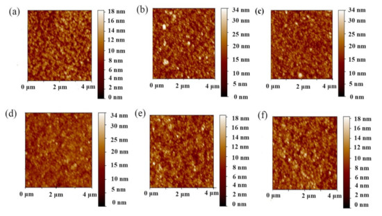 Since the high conduction band value of the MZO layer may prevent electrons being extracted from the active layer and lead to local carrier recombination, we introduced a thin layer of ZnO NC (~10–34 nm) between the MZO and PbS CQDs. To deposit ZnO NC film on ITO/MZO substrates, ZnO NC solution (ZnO NCs dissolved in n-butanol) with different concentrations (the thicknesses of the corresponding ZnO NC layers were 10 nm, 15 nm, 20 nm, 30 nm, 34 nm in 2.5 mg/mL, 5 mg/mL, 10 mg/mL, 15 mg/mL, 20 mg/mL, respectively) was spin-coated onto the substrates and annealed at 100 °C to remove any organic solvents. Atomic force microscopy (AFM) was used to characterize the surface morphology of ITO/MZO/ZnO NC samples with different thicknesses of ZnO NCs. As shown in Figure 4a–f, all samples showed very smooth surfaces with root mean square (RMS) values below 4 nm (the corresponding RMS values are 2.01 nm, 3.61 nm, 3.17 nm, 2.43 nm, 1.81 nm, and 1.82 nm). It was noted that the RMS values for 10 and 15 nm thick ZnO NC layers are 3.61 and 3.17 nm, respectively, significantly higher than other ZnO NC samples, which may be due to the insufficiency of ZnO NCs to fully cover the substrate at a low ZnO NC concentration. The smoothness of the ZnO NC surface is essential to promote the physical contact conditions between ZnO NCs and PbS CQDs and reduce interfacial recombination, and to improve device performance.