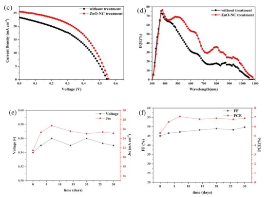 Now let us focus on the influence of the introduction of the ZnO NC thin film with different thicknesses on photovoltaic device performance. As we have just discussed, a ZnO NC thin film with an appropriate thickness is essential to eliminate interface defects and improve device performance. Figure 5a,b show the device structure and cross-section scanning electron microscopic (SEM) images of PbS CQD solar cells. From the SEM images, one can see that the ETLs (~70 nm) and PbS CQD (~300 nm) active layers are compact and there are no pinholes in a large area. The energy dispersive X-ray spectroscopy (EDS) spectrum presented in Figure S2 shows that the ratio between Pb and S is near 1:1, indicating the total conversion of S to PbS during the reaction. For this part of the research, the thickness of ZnO NC film was varied from 0 to 34 nm, whereas the thicknesses of the MZO and PbS CQD films were fixed at 50 and 300 nm, respectively, with the device structures of ITO/MZO/ZnO NC/PbS/Au. In other words, all the experimental parameters were fixed except the thickness of ZnO NCs. The PCEs with and without ZnO NCs are presented in Figure 5c. The J-V curves for different ZnO NC thicknesses under light are presented in Figure S2 and the dark J-V curves are presented in Figure S3. The detailed photovoltaic parameters are summarized in Table 2. It should be noted that the PCEs of PbS CQD solar cells increase with ZnO NCs from 15 to 20 nm, and experience a degradation as the thickness of the ZnO NC layer exceeds 20 nm. The optimal PCE is obtained in the 15 nm ZnO NC device, which shows the following merits: a Jsc of 26.72 mA/cm2, a Voc of 0.56V, an FF of 47.12%, and a PCE of 7.09%. Meanwhile, the control device with a single MZO as an ETL exhibits a Voc of 0.54 V, a Jsc of 23.36 mA/cm2, and an FF of 43.47%, resulting in a PCE of 5.52%. As a result, the optimal PCE value is 30% higher than that of the control device. For a device with a ZnO NC layer thickness of less than 15 nm, it is anticipated that interface recombination will occur because of the inadequate coverage of the MZO film. Moreover, when the ZnO NC layer is too thick, the series resistance will increase, which leads to low FF and PCE. The external quantum efficiency (EQE) spectra shown in Figure 5d provide insights for understanding how the Jsc of the devices was affected by the ZnO NC layer. In comparison to a device without ZnO NCs, the EQE spectrum of the ZnO NC device exhibits a high carrier extraction rate in the wavelength range from 400 to 900 nm, suggesting an enhanced carrier collection with the help of a ZnO NC interlayer since the interface defects can be effectively eliminated. The integrated current densities of 25 mA/cm2 and 22 mA/cm2 are obtained from EQE curves, which are consistent with our J-V measurement (Figure 5c). We noted that the FF of optimized PbS CQD solar cells is less than 50%, which implies that high series resistance and low parallel resistance existed in CQD solar cells. We speculate that although the introduction of ZnO NCs improves the FF and PCE of PbS CQD solar cells, carrier recombination will still occur in the active layer and the ZnO/PbS interface as the devices are fabricated under ambient conditions. The experimental conditions, such as humidity, temperature, and cleanliness, should be well controlled to further improve the performance of PbS CQD solar cells. It should be pointed out that the device stability is one of the major issues for PbS CQD solar cells. We examined the stability of NC solar cells by testing the device performance preserved under ambient conditions at intervals of several days over a relatively long period. In our CQD solar cell configuration, the stability is mainly related to the quality of the PbS CQD/ZnO NC interface, the PbS CQD active layer, and the contact electrode. As shown in Figure 5e,f, the PCE, Jsc, and Voc reach their maximum value at day 7, which then remained almost unchanged after preservation under ambient conditions for 30 days. The increase in device performance after 7 days may be due to the reduced interface recombination between CQDs and the CQD/Au interface, which was also confirmed in the literature [39]. The device with an MZO/ZnO NC ETL maintained 97.7% of its maximum PCE after being placed in ambient conditions for such a period. We speculate that the introduction of a ZnO NC layer might also benefit the stability of CQD solar cells.